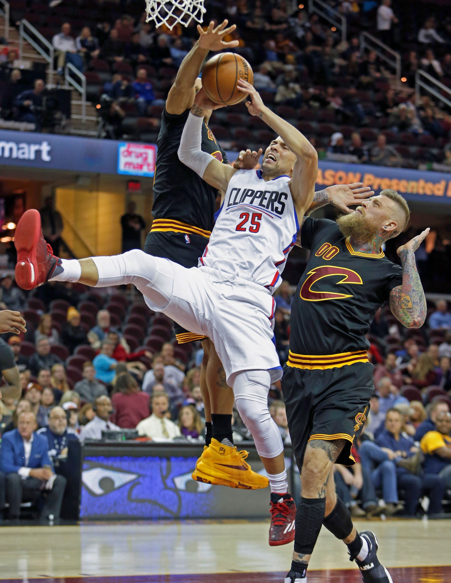 Los Angeles Clippers' Austin Rivers goes up for a shot against Cleveland Cavaliers' Chris Andersen and Richard Jefferson during the second half Dec 1 in Cleveland.